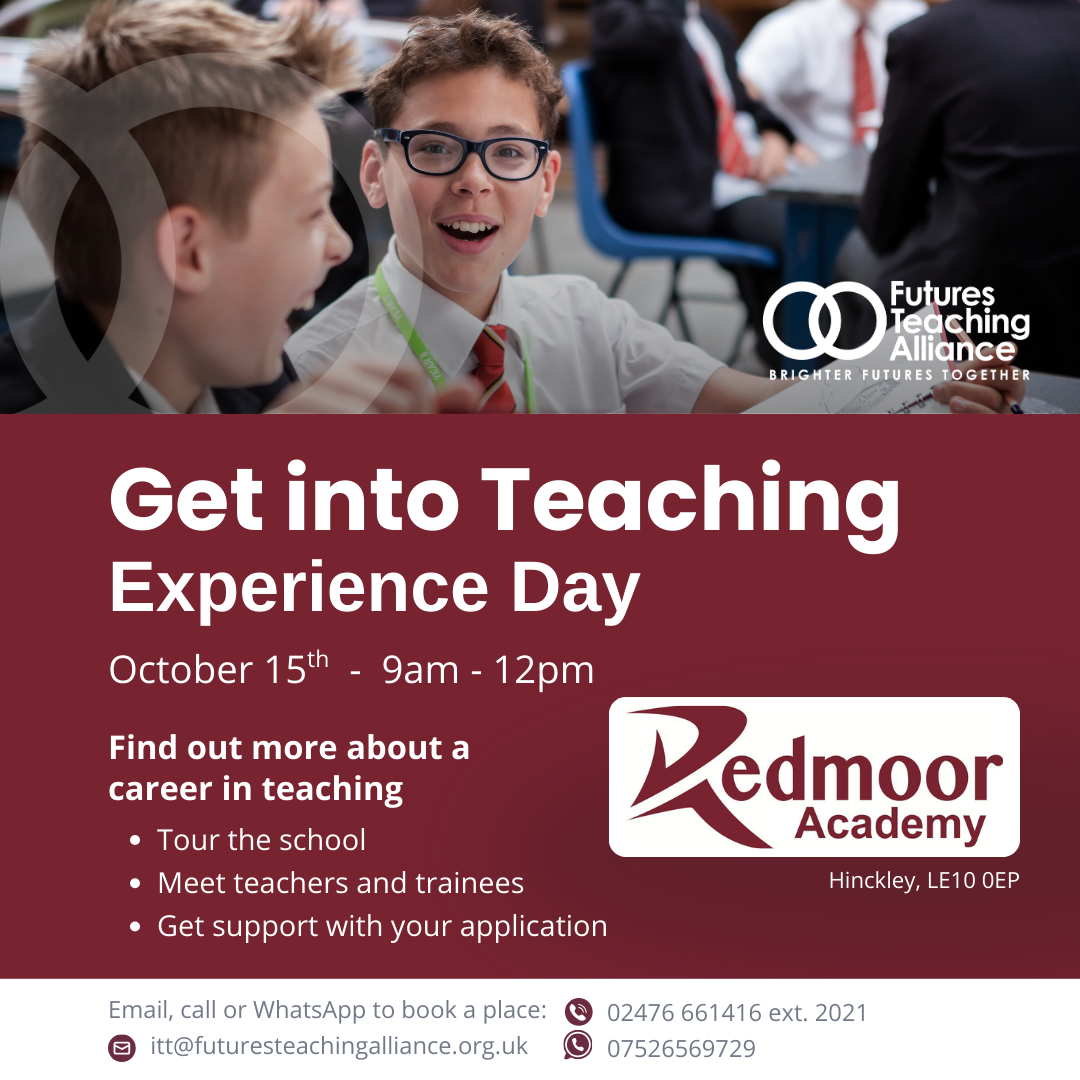 Are you interested in finding out more about a career in teaching? If so, come and join us for a Get Into Teaching Experience Day, held at Redmoor on Wednesday 15th October.