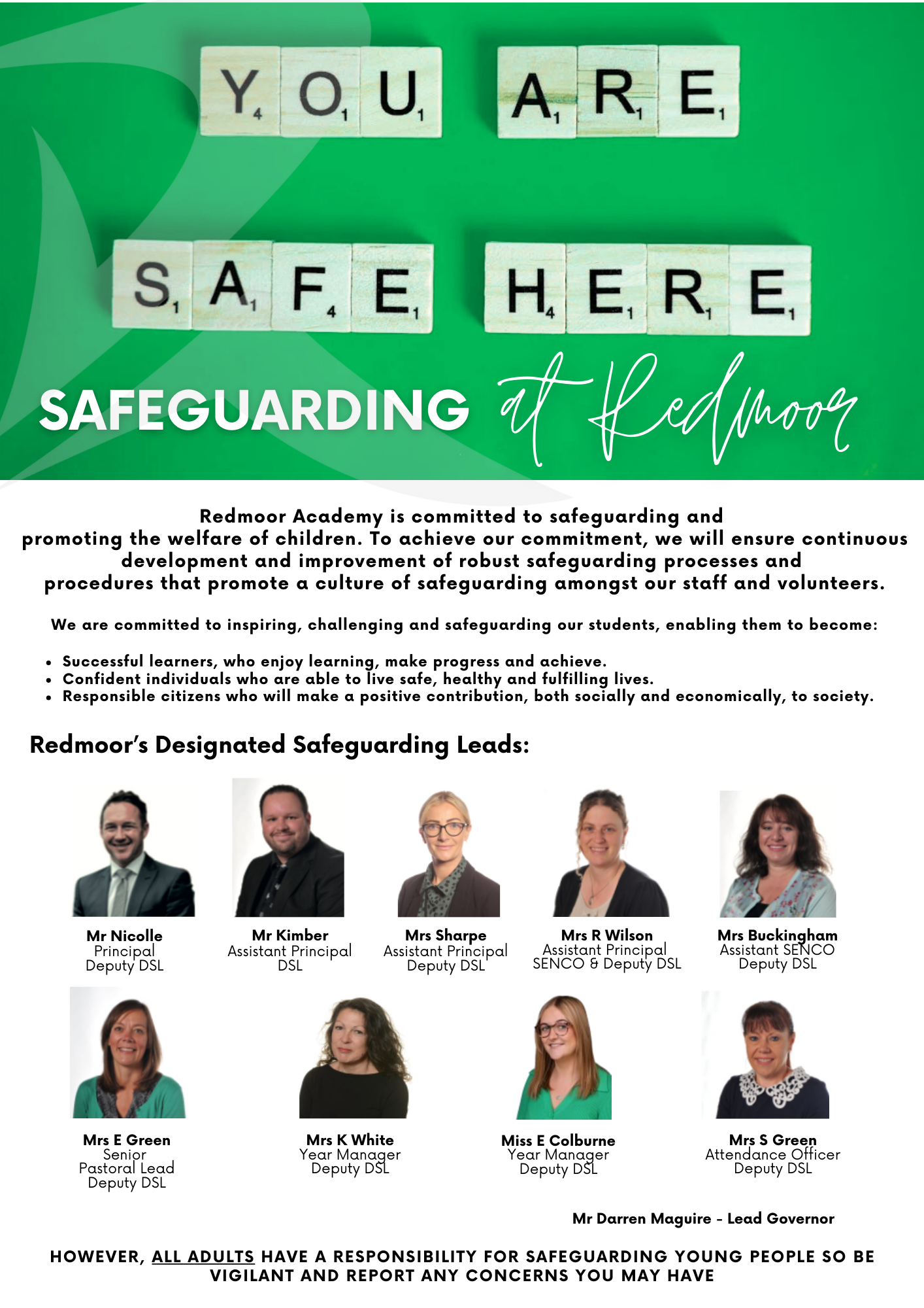 The Designated Safeguarding Lead staff and the Governor with responsibility for overseeing Safeguarding at Redmoor Academy are featured below. Please contact any of the staff should you have any safeguarding concerns.